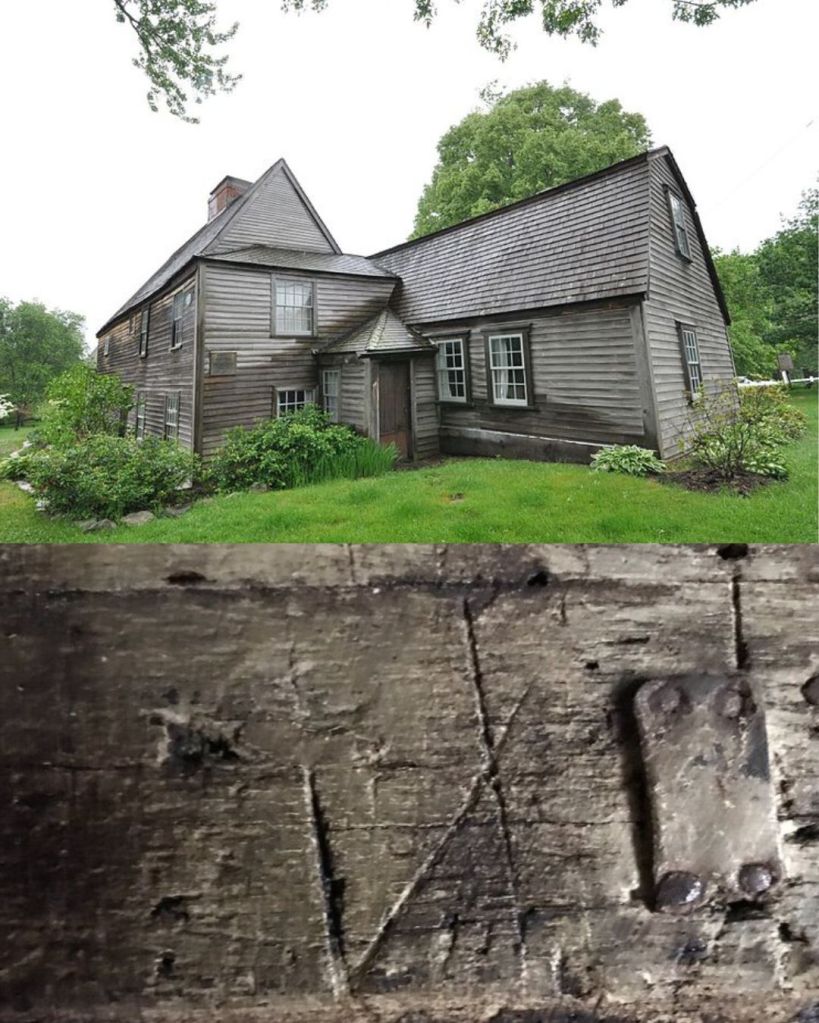 The Fairbanks House is the oldest surviving timber-frame home in the United States. Its age was verified by dendrochronology, with the oldest parts of the home dating back to 1637. The home stayed within the same family for eight (8) generations until the 20th century, and has never had a mortgage on it. The property was declared a National Historic Landmark in 1961 and is on the National Register of Historic Places. Beyond the surface, the Fairbanks House contains superstitious signs to ward off evil, witches, and fire. Hex marks (one pictured above) were found throughout the house, most on structural additions (not the original property). A St. Andrew’s cross and “demon trap” (a series of complex lines meant to capture and confuse demons) were found at the original location of the front door. Old shoes were found in the chimney, which would trap demons and witches and protect the families.